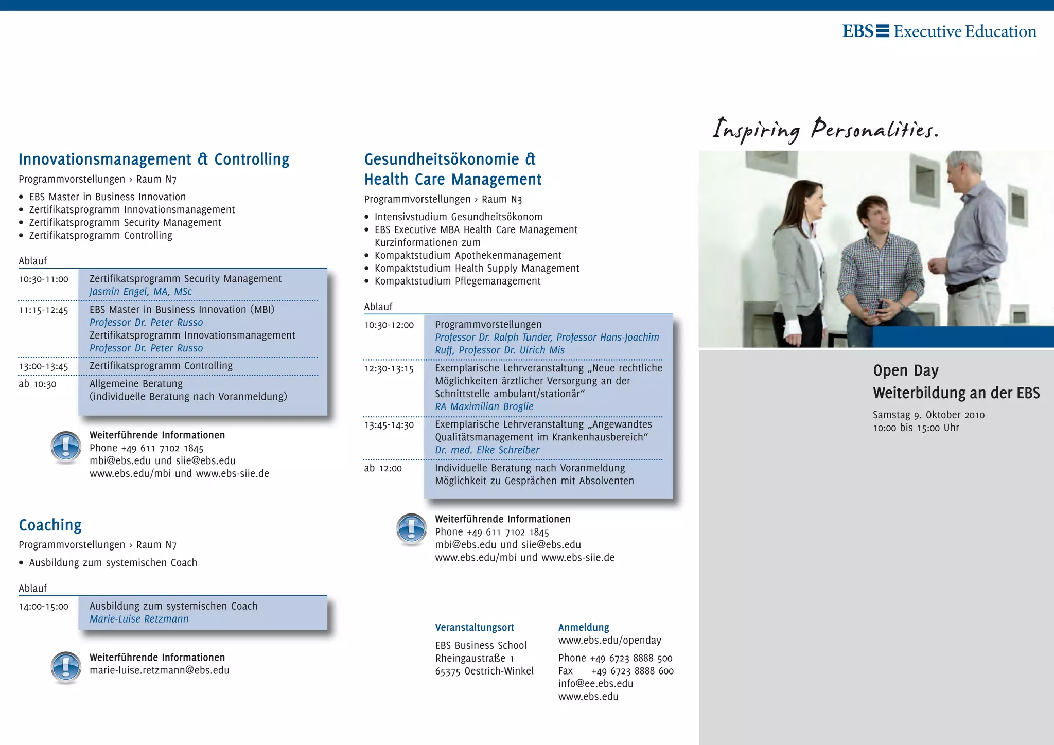 Das Dokument beschreibt die Programmvorstellungen und Informationen zu verschiedenen Weiterbildungsangeboten an der EBS Business School, einschließlich Gesundheitsökonomie, Innovationsmanagement und Immobilienwirtschaft. Es beinhaltet Termine für Beratungen, exemplarische Lehrveranstaltungen und Kontaktinformationen für Interessierte. Der Open Day findet am 9. Oktober 2010 statt und bietet persönliche Beratung sowie Gespräche mit Absolventen.