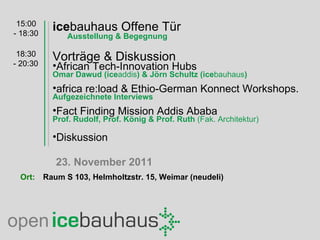 Am 23. November 2011 fand von 15:00 bis 20:30 eine Veranstaltung im ICE Bauhaus in Weimar statt, die sich mit Innovation, Zusammenarbeit und Unternehmertum in Afrika beschäftigte. Die Veranstaltung umfasste Vorträge und Diskussionen zu afrikanischen Technologien, Workshops und Interviews, durchgeführt von verschiedenen Professoren der Fakultät Architektur. Ziel war es, den Austausch zwischen Ethio-German Konnect und afrikanischen Tech-Innovation-Hubs zu fördern.