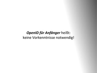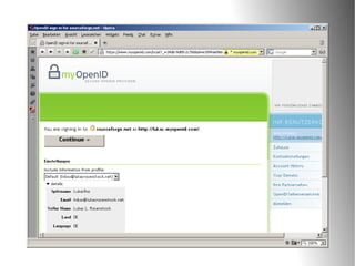Das Dokument erklärt OpenID als dezentralen Ansatz zur Identitätsverwaltung im Internet, der es Nutzern ermöglicht, sich mit einem einzigen Passwort bei verschiedenen Diensten anzumelden. Es wird betont, dass OpenID kein Passwortmanager ist und dass jeder Nutzer die Kontrolle über seine Identität hat, indem er selbst entscheiden kann, bei welchem Provider er sich registriert. Zudem werden Sicherheitsbedenken und Gegenargumente erläutert, um die Vorteile und Herausforderungen von OpenID zu verdeutlichen.