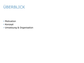 Das Dokument beschreibt ein Konzept für eine Ringvorlesung unter der Leitung von Prof. Dr. Martin Bogdan an der Universität Leipzig, die den Praxisbezug für Studierende der Informatik und Wirtschaftsinformatik stärkt. Die Vorlesung wird durch Kooperationen mit regionalen Unternehmen unterstützt, wobei Studierende praxisnahe Probleme bearbeiten und direkt mit den Praxispartnern interagieren können. Die Umsetzung beginnt im Wintersemester 2012 und beinhaltet eine strukturierte Organisation sowie Kommunikationsunterstützung durch Community Management.