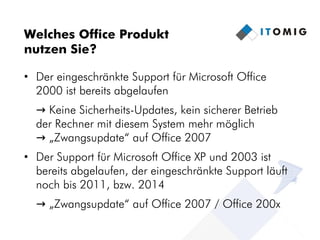 Das Dokument nennt zehn Gründe für den Umstieg auf OpenOffice, darunter den abgelaufenen Support für ältere Microsoft Office-Versionen und die plattformübergreifende Verfügbarkeit von OpenOffice. Es verweist auf Vorteile wie die Nutzung bewährter Menüstrukturen, die Möglichkeit zur PDF-Erstellung und -Bearbeitung sowie flexible Erweiterbarkeit durch Plugins. Zudem bietet OpenOffice kostengünstigen, maßgeschneiderten Support und geringeren Schulungsaufwand im Vergleich zu Microsoft Office.