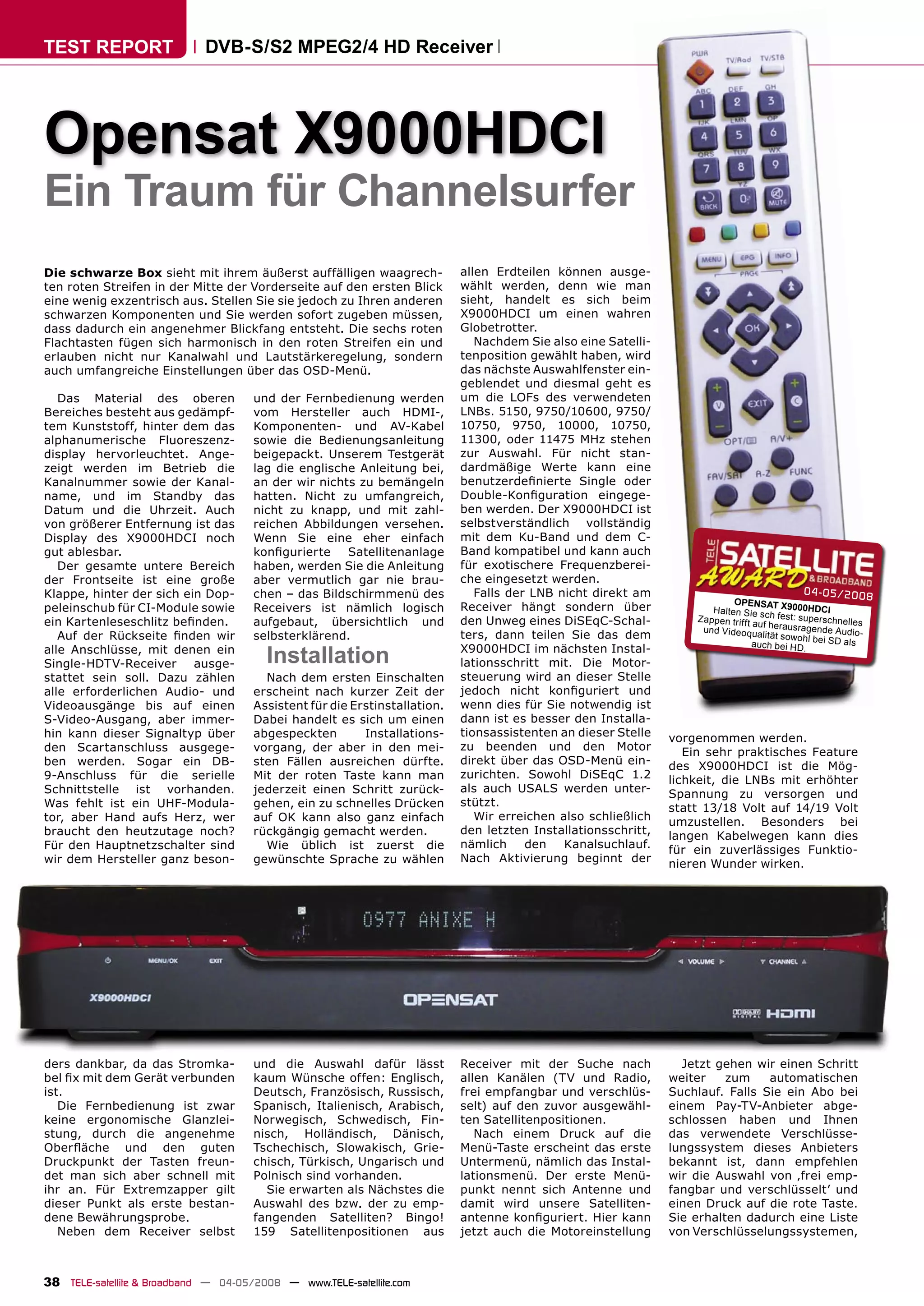 Der Opensat x9000hdci ist ein leistungsstarker HD-Satellitenreceiver, der durch sein ansprechendes Design und eine benutzerfreundliche Oberfläche überzeugt. Er bietet umfassende Funktionen für die Kanalverwaltung und unterstützt eine Vielzahl von Verschlüsselungssystemen, während die Installation und Nutzung dank eines intuitiven Menüs einfach gestaltet sind. Mit seiner hohen Signalqualität und schnellen Umschaltzeiten eignet er sich sowohl für Gelegenheitsnutzer als auch für anspruchsvolle Anwender.