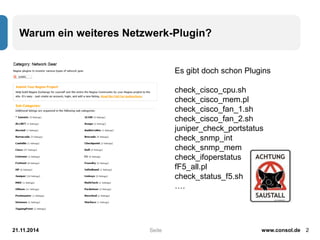 Warum ein weiteresNetzwerk-Plugin? 21.11.2014 www.consol.de 2 Seite Es gibt doch schon Plugins check_cisco_cpu.sh check_cisco_mem.pl check_cisco_fan_1.sh check_cisco_fan_2.sh juniper_check_portstatus check_snmp_int check_snmp_mem check_ifoperstatus fF5_all.pl check_status_f5.sh ….