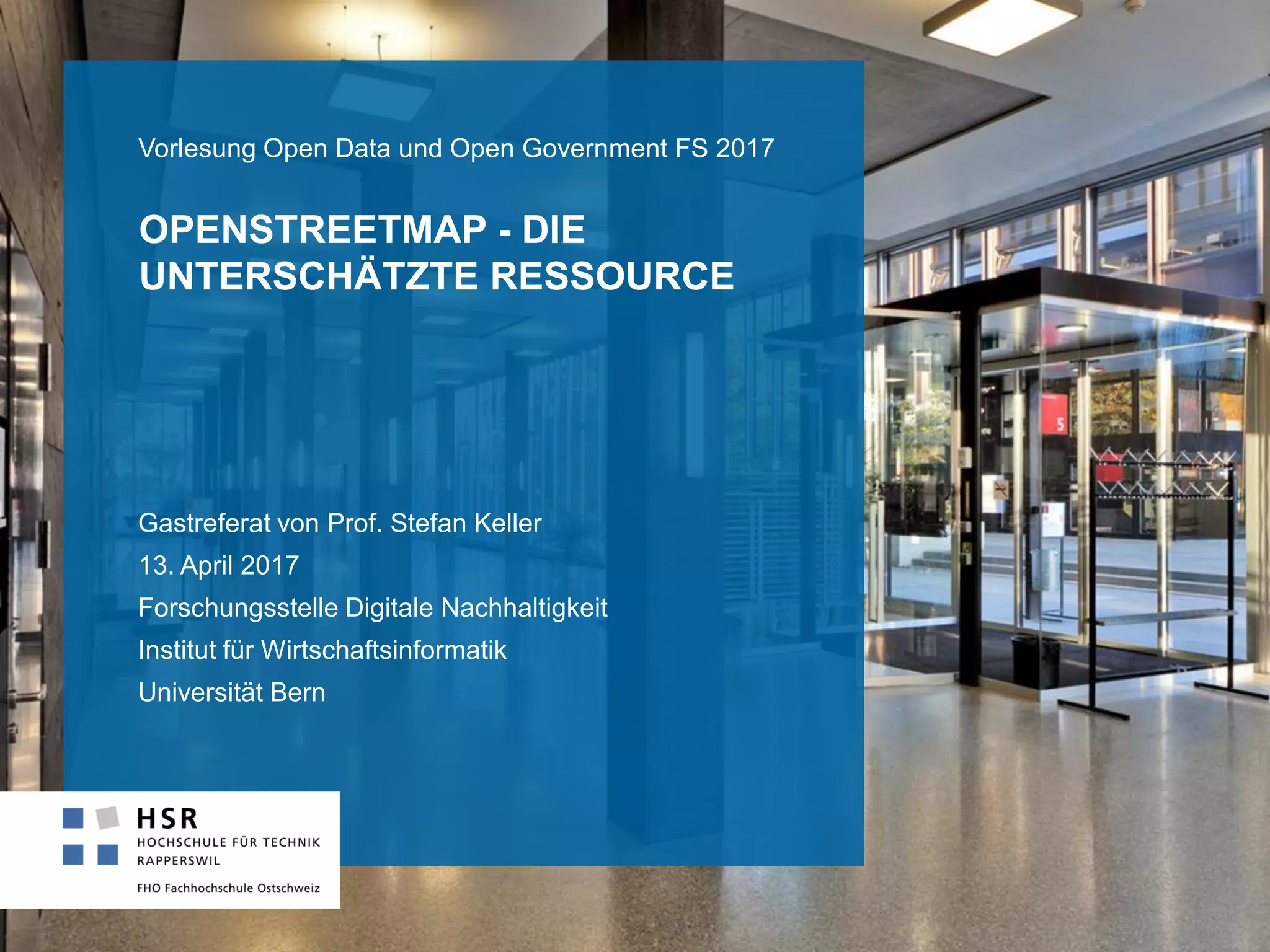 Das Gastreferat von Prof. Stefan Keller thematisiert OpenStreetMap (OSM) als wertvolle, crowdsourced Datenbank für Geoinformationen und deren Anwendung zur Erstellung von Webkarten und Webapps. Der Vortrag behandelt die Ziele, die damit verbundenen Technologien und Software, sowie praktische Beispiele zur Datennutzung und -erstellung. Kernaspekte sind die Herausforderungen bei der Nutzung von Geodaten und die Möglichkeiten, eigene Karten mithilfe von OSM-Daten zu erstellen.