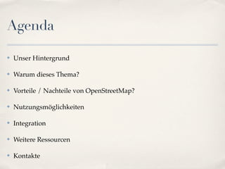 Das Dokument behandelt die Nutzung und Integration von OpenStreetMap in eigene Anwendungen, wobei verschiedene Aspekte wie Vorteile, Nachteile, Nutzungsmöglichkeiten und technische Integrationen thematisiert werden. OpenStreetMap bietet qualitativ hochwertige Karten und eine aktive Community, jedoch hängen die Content-Qualität und die Integrationsmöglichkeiten stark von der lokalen Bewertung ab. Für Entwickler werden verschiedene APIs und Frameworks vorgestellt, um die Geodaten effektiv zu nutzen.