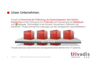 Das Dokument bietet eine Einführung in Backup und Recovery mit Oracle, erläutert die Bedeutung von physischen und logischen Backups und beschreibt verschiedene Backup-Methoden sowie den Einsatz von Oracle Recovery Manager (RMAN). Es werden grundlegende Prinzipien des Datenbank-Backups, Strategien zur Minimierung von Ausfallzeiten und die Notwendigkeit regelmäßiger Prüfungen und Übungen des Recovery-Prozesses besprochen. Zudem werden technische Details zu RMAN und verschiedenen Backup-Varianten wie vollständigen, inkrementellen und differenziellen Backups behandelt.