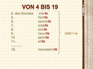 Das Dokument listet die ordinals Zahlen von 4 bis 19 auf, einschließlich unregelmäßiger Formen wie 'erste', 'zweite' und 'dritte'. Darüber hinaus werden die ordinals Zahlen für die Werte ab 20 bis 1000 in einer standardisierten Form präsentiert. Die Struktur folgt einem klaren Muster, wobei der Zahlenwert mit der Endung '-te' oder '-ste' kombiniert wird.