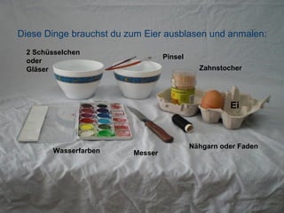 Um Ostereier auszublasen und zu bemalen, benötigt man Wasserfarben, ein Messer, Nähgarn, einen Zahnstocher und Pinsel. Nach dem Ausblasen des Eis müssen die Innenseiten gereinigt und das Ei einen Tag getrocknet werden, bevor es mit einem Zahnstocher zum besseren Halten versehen und anschließend bemalt werden kann. Für eine bessere Haltbarkeit der Farben kann das Ei mit Nagellack lackiert werden.