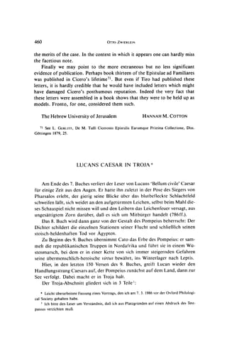 Der Artikel von Otto Zwierlein analysiert Lucans Darstellung von Julius Caesar im Kontext seiner Schilderung von Troja in 'Bellum Civile'. Der Autor diskutiert verschiedene Interpretationen der Troja-Szene, in der Caesar die Ruinen besichtigt und auf die künstlerische Unsterblichkeit anspielt, und erörtert die Möglichkeit, dass die Apostrophe an Caesar möglicherweise an Nero gerichtet ist. Insgesamt wird die Ambivalenz von Caesars Charakter in Lucans Geschichtsdichtung hervorgehoben sowie die Herausforderungen bei der Interpretation dieser komplexen Textpassagen.
