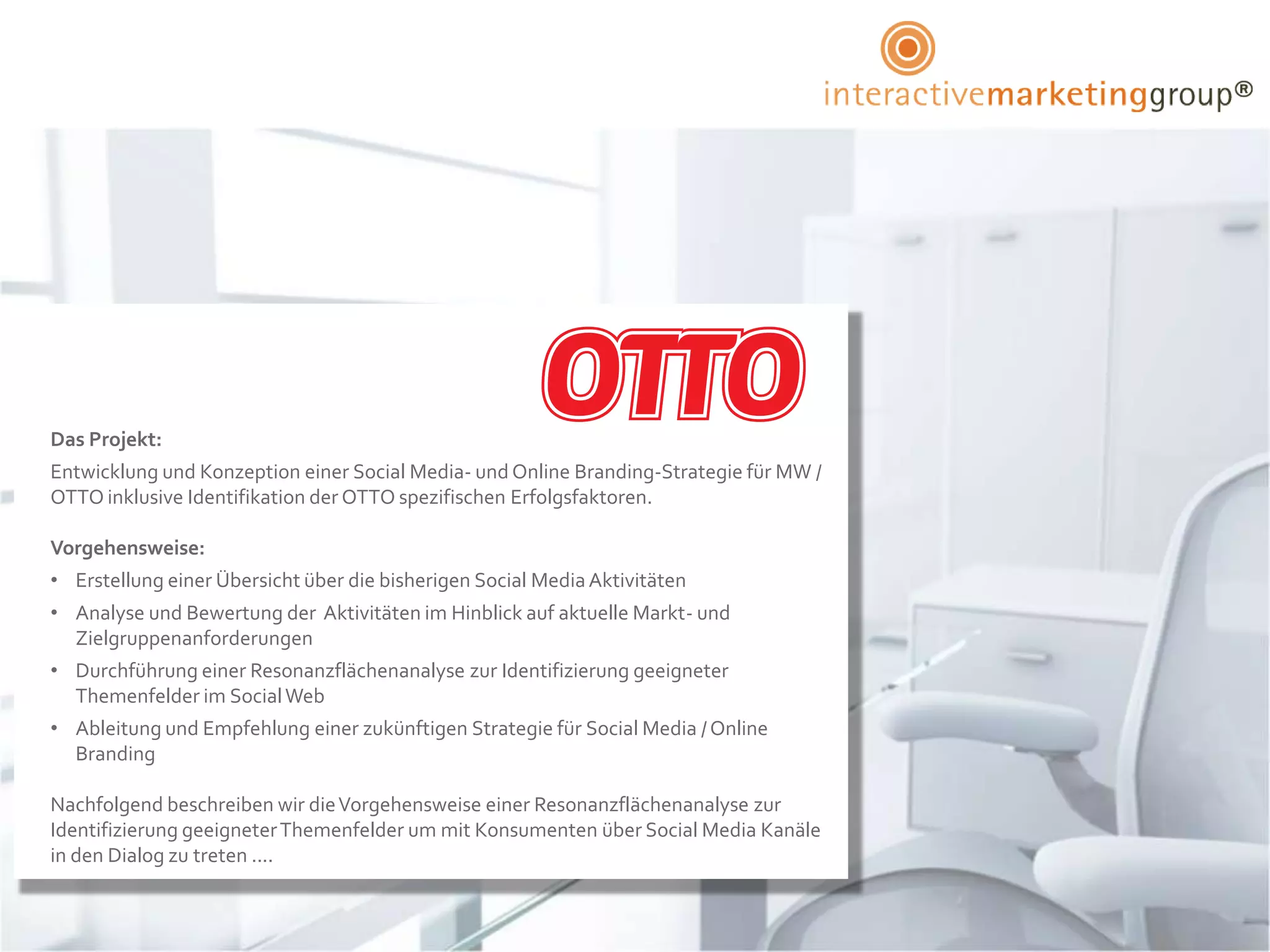 Das Dokument beschreibt die Entwicklung einer Social Media- und Online-Branding-Strategie für MW/Otto, einschließlich der Analyse bestehender Aktivitäten und der Identifikation spezifischer Erfolgsfaktoren. Eine Resonanzflächenanalyse wird durchgeführt, um relevante Themen und Begriffe zu identifizieren, die im Dialog mit Konsumenten verwendet werden können. Die Methodik umfasst die Definition von Themenfeldern, die technische Analyse und die qualitative sowie quantitative Auswertung potenzieller Resonanzflächen.