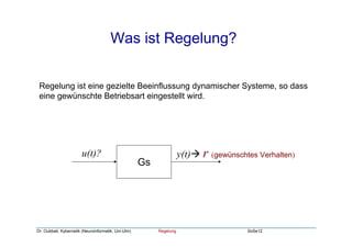 Das Dokument behandelt die Regelung und Steuerung dynamischer Systeme in der Kybernetik, erklärt grundlegende Konzepte wie Stabilität und die Forderungen an Regelkreise. Es wird darauf hingewiesen, dass eine Regelung darauf abzielt, den Ausgang eines Systems an ein gewünschtes Verhalten anzupassen, wobei Störungen berücksichtigt werden müssen. Zusätzlich werden die Anforderungen an Regelkreise, wie geringe Regelabweichung und kurzes Ansprechverhalten, thematisiert.