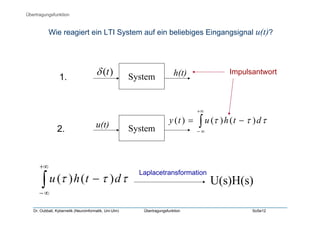 Das Dokument behandelt die Übertragungsfunktion von LTI-Systemen und deren mathematische Darstellung im Laplace-Bereich. Es erklärt, wie ein System auf Eingangssignale reagiert und bietet Beispiele für blockschaltbilder. Zudem werden Konzepte wie Parallel- und Rückkopplungssysteme erläutert.