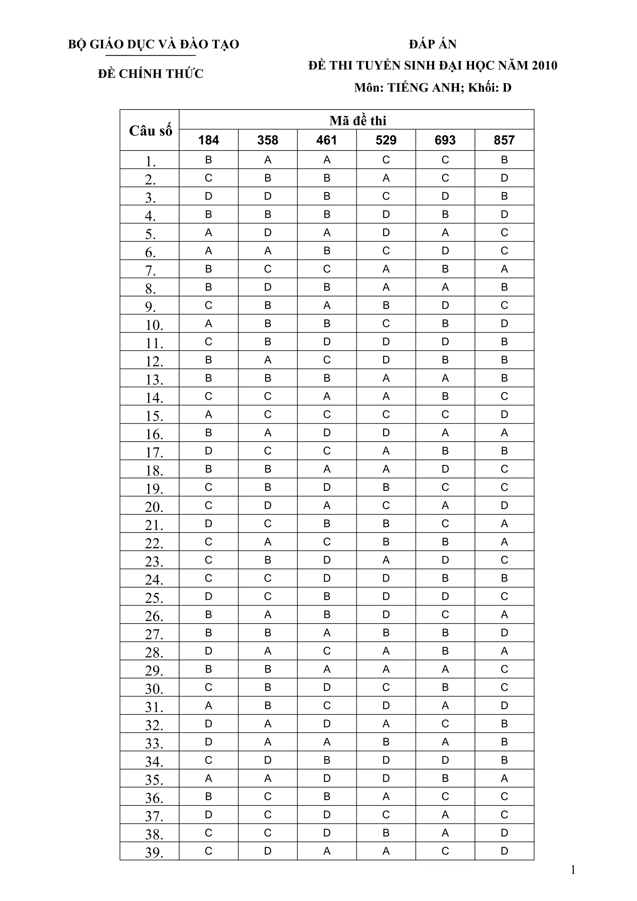 Das Dokument enthält die offiziellen Antworten für die Zulassungsprüfung in Englisch für das Jahr 2010. Die Antworten sind in Form von Multiple-Choice-Antworten aufgelistet, wobei insgesamt 80 Fragen behandelt werden. Jede Frage ist durch eine Nummer identifiziert, und die entsprechenden Antworten werden in einer tabellarischen Anordnung präsentiert.