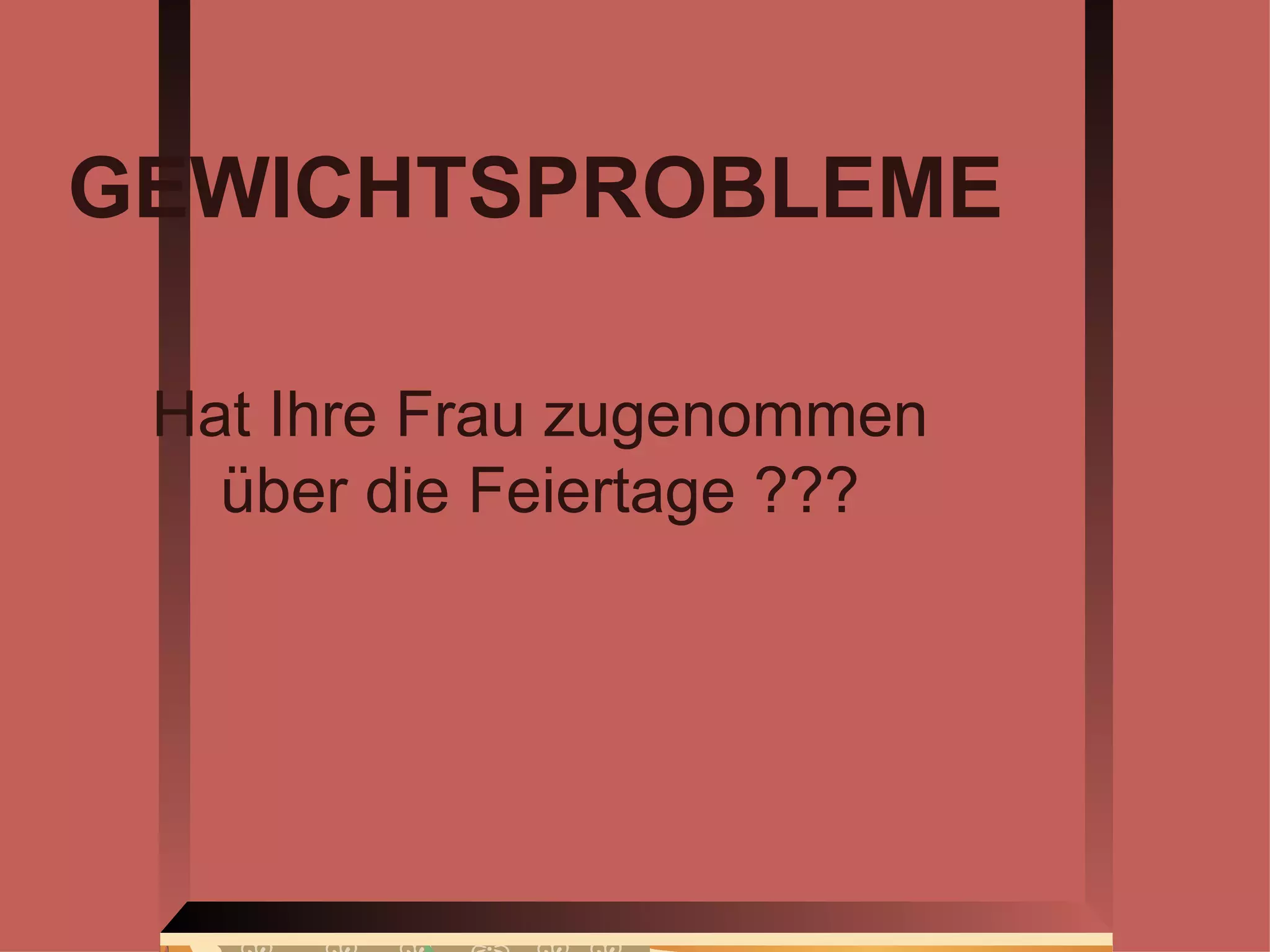 Das Dokument enthält einen humorvollen Vorschlag zur Gewichtsreduktion nach den Feiertagen. Es wird empfohlen, dass die Frau täglich 10 Kilometer geht, um ihr Gewicht zu reduzieren. Innerhalb einer Woche könnte sie demnach bereits 70 Kilometer zurückgelegt haben.