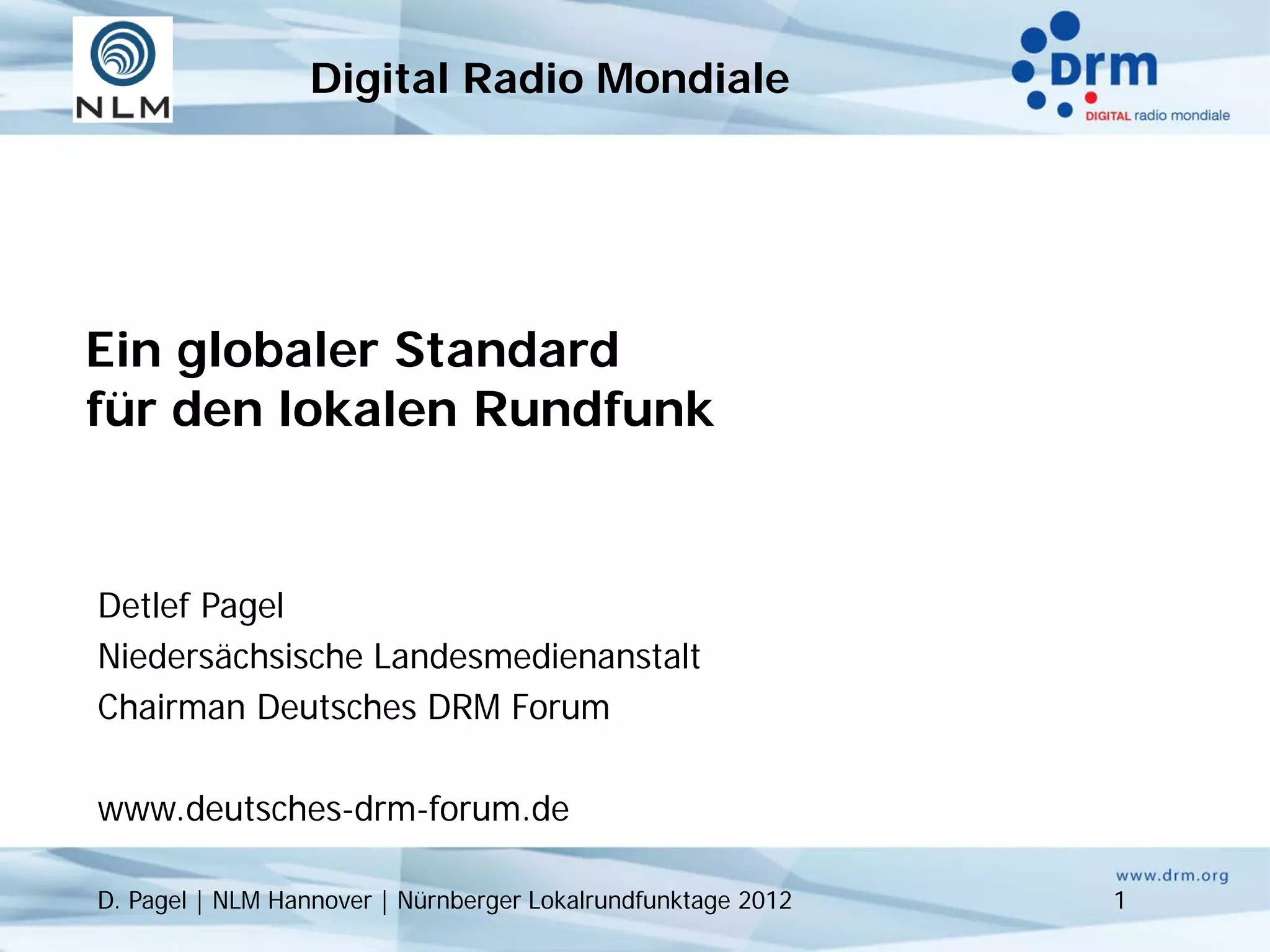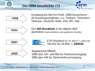 Das Dokument beschreibt die Entwicklung des Digital Radio Mondial (DRM) als globalen Standard für digitalen Rundfunk, einschließlich der Gründung des DRM-Konsortiums im Jahr 1998 und der frühen Implementierungen bis 2012. Es hebt die Notwendigkeit hervor, lokale Rundfunkdienste in die digitale Welt zu überführen, um den Herausforderungen des analogen Hörfunks zu begegnen, insbesondere in Bezug auf Reichweite und Frequenznutzung. Der DRM+ Standard wird als Lösung für die künftigen Anforderungen des lokalen Rundfunks vorgestellt.