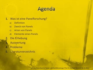 Das Dokument erläutert die Grundlagen der Panelforschung, einschließlich ihrer Definition, ihres Zwecks und der verschiedenen Panelarten wie Handels-, Verbraucher- und Fernsehzuschauerpanel. Es beschreibt außerdem die Elemente eines Panels, die methodischen Ansätze zur Datenerhebung und -auswertung sowie die Herausforderungen in diesem Forschungsbereich. Zudem wird auf relevante Literatur verwiesen, die die Thematik vertieft.