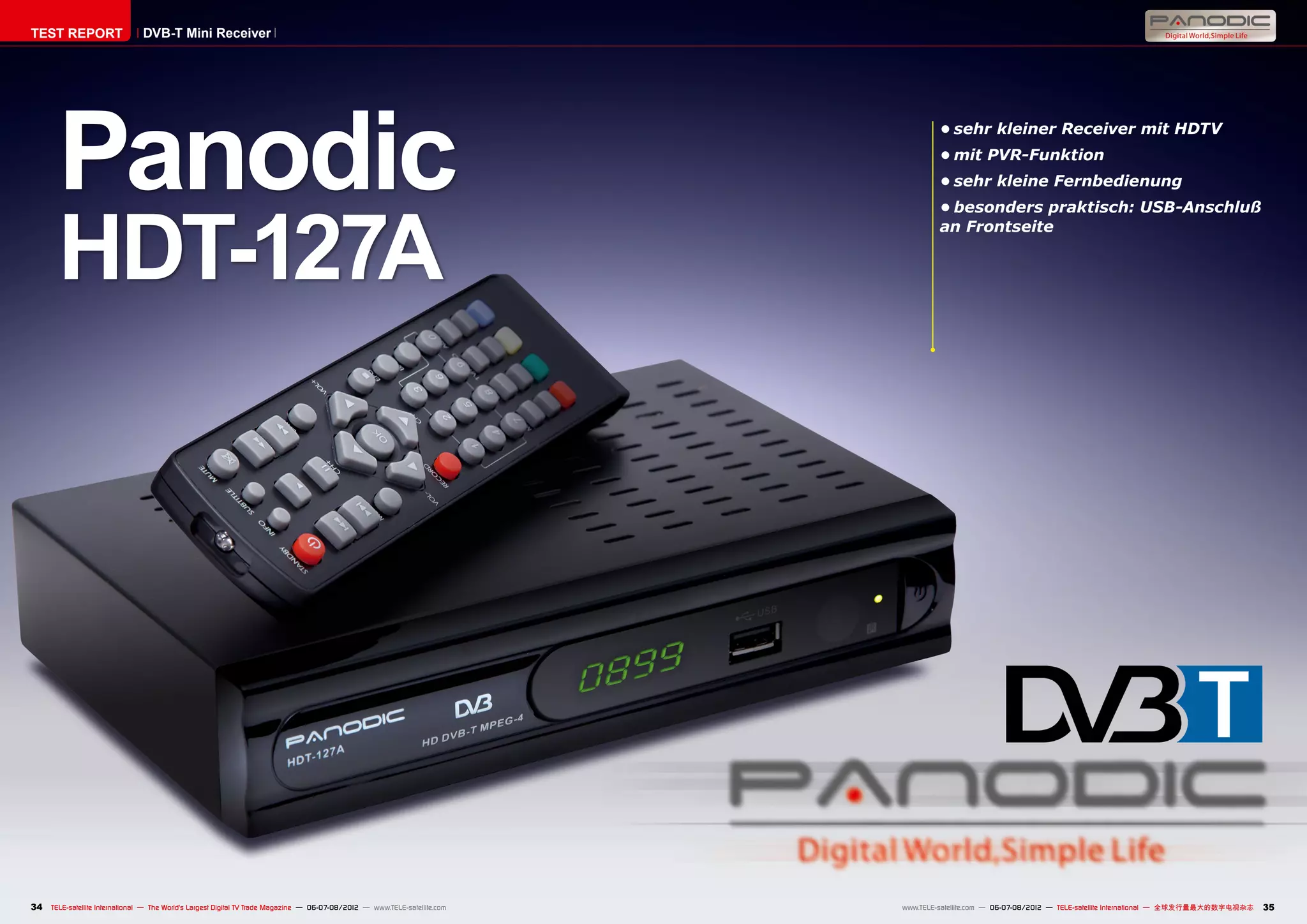 Der Panodic HDT-127A ist ein kompakter DVB-T Mini-Receiver, ausgestattet mit PVR-Funktionalität und einem benutzerfreundlichen Installationsassistenten. Er bietet vielseitige Anschlussmöglichkeiten, darunter USB 2.0, HDMI und Scart, sowie Unterstützung für verschiedene HD-Auflösungen und eine anpassbare Kanalliste. Im Test beeindruckte das Gerät durch seine einfache Bedienung, gute Verarbeitungsqualität und vielseitige Funktionen, einschließlich Timeshift und EPG-Integration.