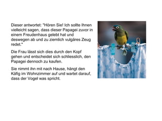 Frau Gunkel kauft einen Papagei aus einer Tierhandlung, der zuvor in einem Freudenhaus lebte, was dazu führt, dass er vulgäre Ausdrücke von sich gibt. Trotz der anfänglichen Schocksituation und den beleidigenden Kommentaren, die der Papagei gegenüber ihrer Familie äußert, beschließt die Familie, darüber zu lachen. Schließlich begrüßt der Papagei den Familienvater mit einem freundlichen 'halloo bernd!'.