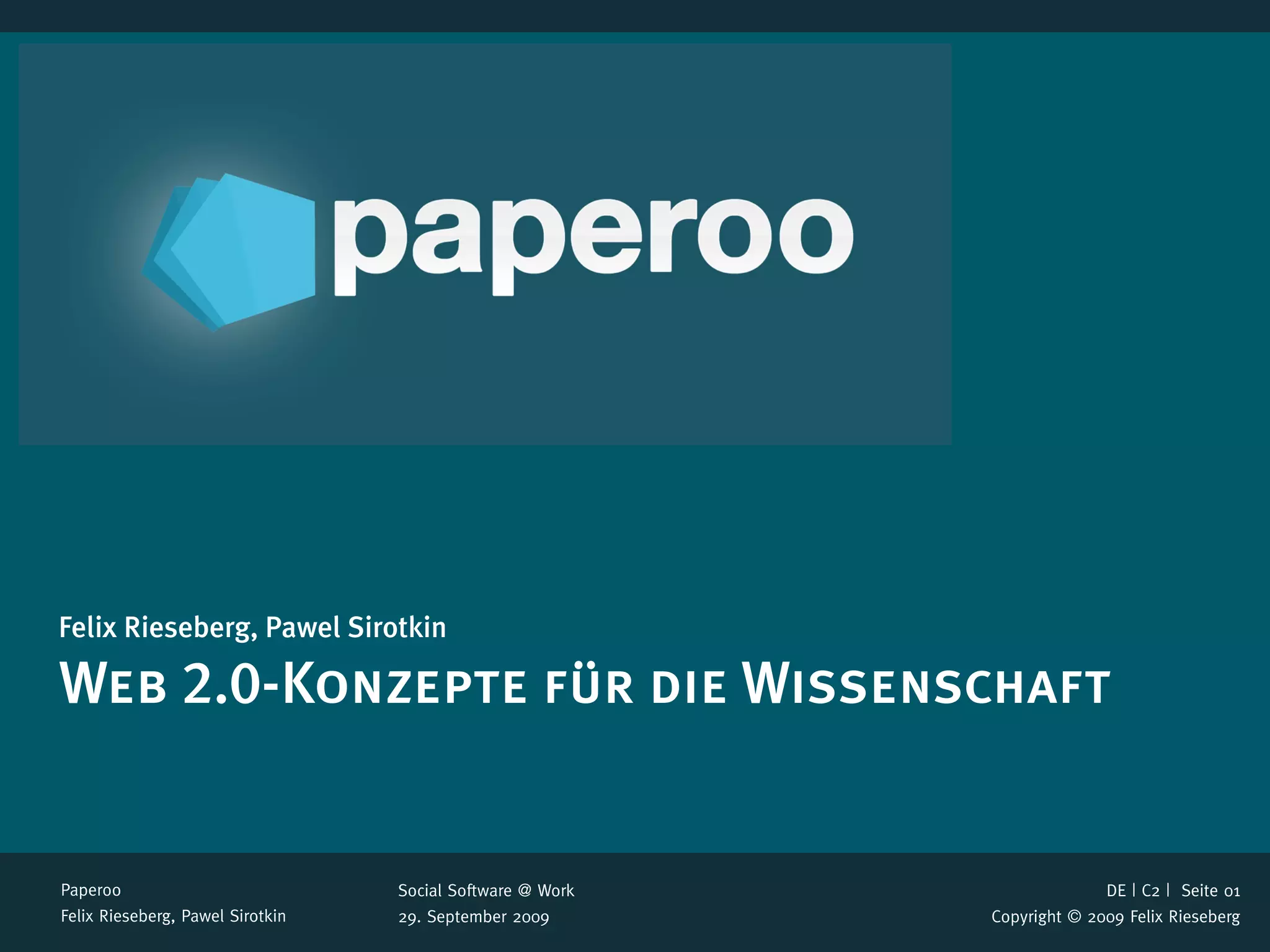 Das Dokument beschreibt die Rolle von Web 2.0-Prinzipien in der Wissenschaft, insbesondere die langsame Anpassung der wissenschaftlichen Gemeinschaft an neue Technologien und die Unzulänglichkeit bestehender Angebote. Es wird ein Konzept für eine soziale Software namens Paperoo vorgeschlagen, die ein umfangreiches Publikationssystem und offene Peer-Reviews umfasst, um die Qualität der wissenschaftlichen Veröffentlichungen zu verbessern. Offene Fragen zur Vertrauensbildung und Leserfeedback werden ebenfalls angesprochen.
