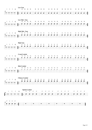 Das Dokument enthält musikalische Notationen für verschiedene Trommeln und Cymbals, einschließlich Bassdrum, Snare, Hi-Hats, Toms und Cymbals. Es präsentiert rhythmische Muster und Notenwerte, die für Musiker zur Erstellung von Musikstücken und Übungen verwendet werden können. Die enthaltenen Noten sind in eine strukturierte Form gegliedert, um eine einfache Lesbarkeit und Anwendung zu ermöglichen.