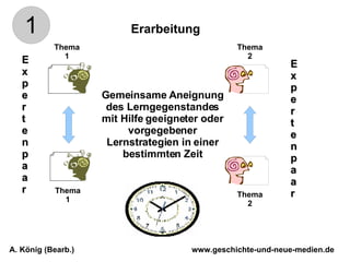 Das Dokument beschreibt die Methodik der 'Partner-Puzzle'-Methode zur Aneignung von Wissen durch Expertenpaare in bestimmten Themen. Es umfasst die Schritte der Wissensvermittlung und -verarbeitung in vorgegebenen Zeitrahmen. Diese Methode fördert eine effektive gemeinsame Arbeitsweise und Repräsentation des gelernten Stoffes.