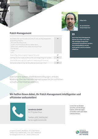 Die Coretress GmbH bietet professionelles Patch Management an, um die regelmäßige Aktualisierung von Software zu automatisieren und Sicherheitslücken zu schließen. Dadurch werden lästige Update-Aufforderungen vermieden, die IT-Stabilität gewährleistet und die Arbeitsabläufe der Kunden optimiert. Mit zentralem Monitoring und direkter Alarmierung bei kritischen Updates unterstützt Coretress eine effektive IT-Umgebung.