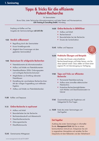 Das Praxis-Seminar zur Patent-Recherche bietet Teilnehmenden umfassende Methoden zur effizienten Informationssuche über Patente in Datenbanken und im Internet. Mit praktischen Übungen am PC lernen die Teilnehmer, relevante Patentklassen zu identifizieren und Suchmaschinen sowie soziale Medien effektiv einzusetzen. Experten geben wertvolle Einblicke in die Struktur von Patentdokumenten und die Vorbereitung von Schutzrechtsanmeldungen.