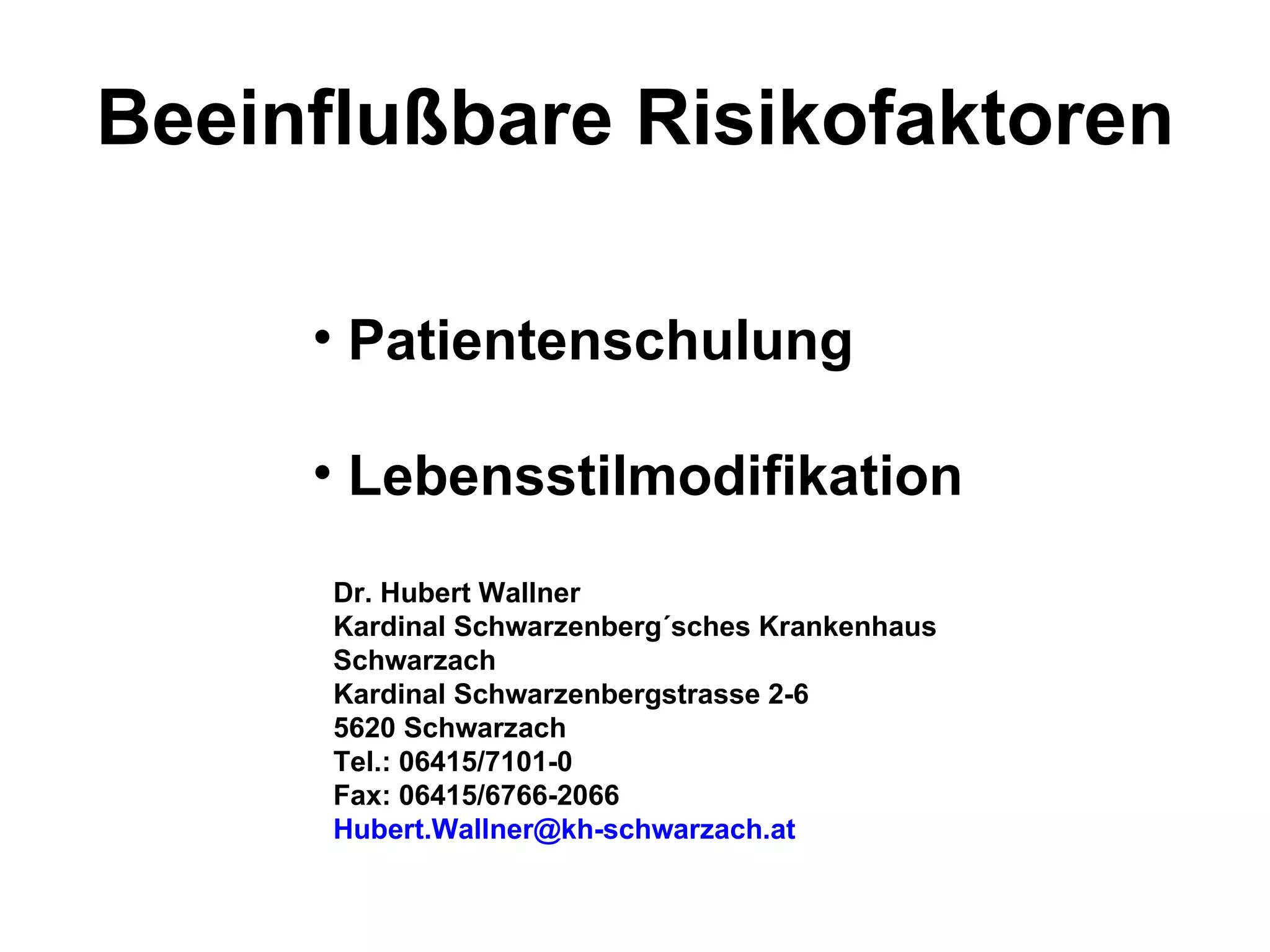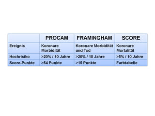 Das Dokument thematisiert Risiko-Management und Präventionsstrategien zur Erhaltung der kardiovaskulären Gesundheit, wobei es modifizierbare Risikofaktoren wie ungesunde Ernährung, Bewegungsmangel und Tabakkonsum anführt. Es stellt evidenzbasierte Statistiken über Mortalität und Morbidität in Bezug auf arteriosklerotische Erkrankungen vor und diskutiert die Bedeutung einer Risikostratifizierung zur Frühidentifikation von hochrisikobehafteten Patienten. Zudem wird das Wachstum von Adipositas in der Bevölkerung thematisiert und die Notwendigkeit langfristiger Behandlungsansätze hervorgehoben.