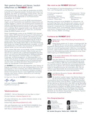 Die Payment 2010, die vom 18. bis 20. Mai 2010 in Frankfurt am Main stattfindet, umfasst Seminare, einen Kongress und Workshops zu Themen wie SEPA, Forderungsmanagement und mobile Zahlungsverfahren. Branchenexperten werden aktuelle Herausforderungen und Lösungen im Zahlungsverkehr sowie rechtliche Rahmenbedingungen diskutieren, um Unternehmen bei der Optimierung ihrer Zahlungsabwicklungen zu unterstützen. Die Veranstaltung richtet sich an Fach- und Führungskräfte verschiedener Branchen, die an sicheren und effizienten Zahlungsprozessen interessiert sind.