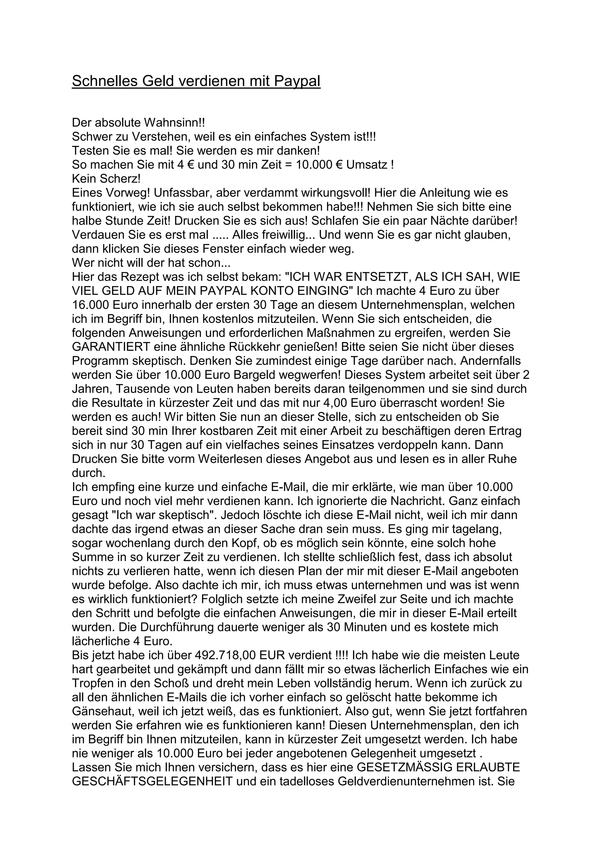 Das Dokument beschreibt ein System, mit dem man angeblich mit einer Investition von 4 Euro und 30 Minuten Zeit einen Umsatz von 10.000 Euro oder mehr innerhalb von 30 Tagen erzielen kann. Es handelt sich um ein Verfahren, bei dem Nutzer eine bestimmte E-Mail an 40 Personen versenden müssen, um Teil des Programms zu werden und Geld zu verdienen. Der Autor betont, dass das System seit über zwei Jahren zuverlässig funktioniert und viele Menschen bereits positive Ergebnisse erzielt haben.