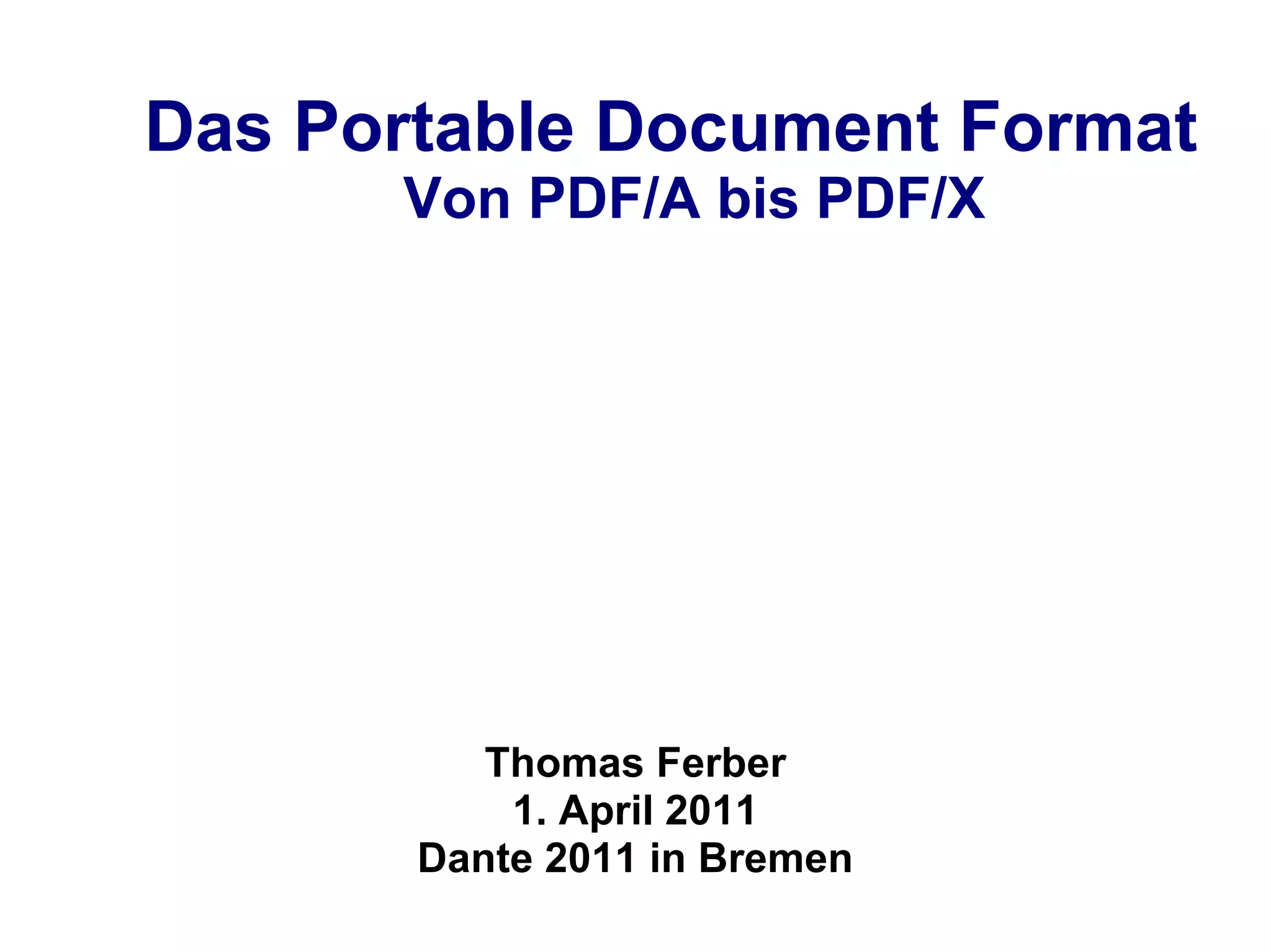 Das Dokument behandelt die Entwicklung und Eigenschaften des Portable Document Format (PDF) sowie dessen Abwandlungen wie PDF/A für die Langzeitarchivierung und PDF/X für die Druckindustrie. Es erläutert die Unterschiede zwischen PostScript und PDF sowie die verschiedenen Versionen und deren Merkmale. Zudem werden Anforderungen an die Barrierefreiheit und die Einhaltung von Standards zur Sicherstellung der Zugänglichkeit von PDFs für sehbehinderte Nutzer beschrieben.