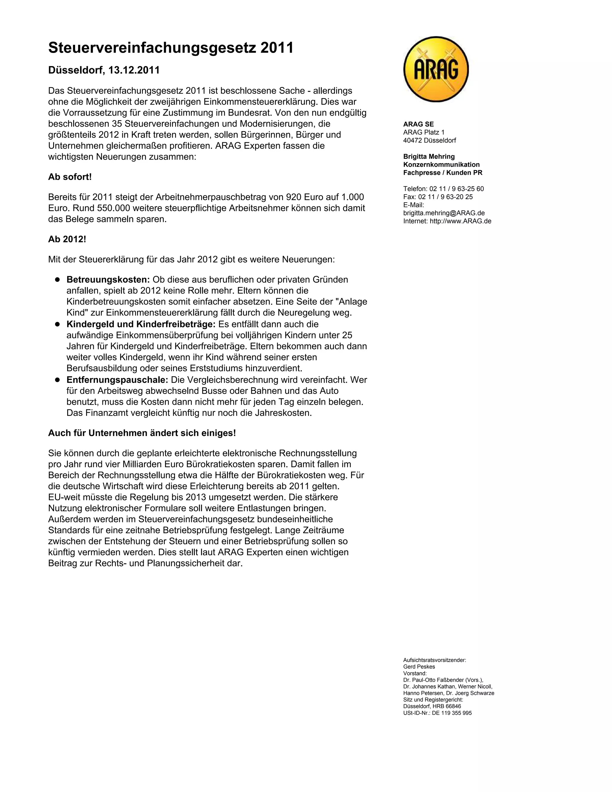 Das Steuervereinfachungsgesetz 2011 umfasst 35 Neuerungen, die ab 2012 in Kraft treten, um Bürger und Unternehmen zu entlasten. Zu den wesentlichen Änderungen gehören Erhöhungen des Arbeitnehmerpauschbetrags, vereinfachte Absetzbarkeit von Betreuungskosten und eine vereinfachte Berechnung der Entfernungspauschale. Zudem sollen die elektronische Rechnungsstellung und einheitliche Standards für Betriebsprüfungen die Bürokratie reduzieren und die Planungssicherheit erhöhen.