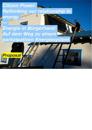 Stefan Müller präsentiert sein Proposal für das Masterstudium an der FH Potsdam, in dem er sich mit der häuslichen Energienutzung und der Rolle von Verbrauchern in einem dezentralisierten Energiesystem auseinandersetzt. Er argumentiert, dass neue partizipative Praktiken und innovative Dienstleistungen notwendig sind, um nachhaltige Energieerzeugung und -nutzung im Alltag zu fördern. Der Wandel hin zu aktiven Energieproduzenten wird als kulturell prägend dargestellt und soll durch gestaltende Strategien unterstützt werden.