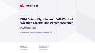 Das Dokument behandelt die PDM-Datenmigration im Zusammenhang mit einem CAD-Wechsel und beschreibt wichtige Aspekte, Vorgehensweisen und Herausforderungen. Besondere Aufmerksamkeit gilt der Konvertierungsstrategie, die idealerweise mit den Zielen des neuen Systems übereinstimmen sollte, sowie der komplexen, zeitaufwändigen Natur der CAD-Konvertierung. Empfohlene Ansätze beinhalten inkrementelle Konvertierung, manuelles und automatisiertes Neumodellieren sowie die Entscheidung für eine featurebasierte Migration.