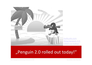 Das Dokument thematisiert das Google-Algorithmus-Update 'Penguin 2.0', das am 22. Mai 2013 eingeführt wurde und 2,3 % der Suchergebnisse betrifft, insbesondere Unterseiten. Es werden auch frühere Updates erwähnt, wie das Panda- und das Exact Match Domain-Update, die alle darauf abzielen, die Qualität der Suchergebnisse zu verbessern. Die wesentliche Frage am Ende ist, ob die eigene Webseite ebenfalls von diesen Änderungen betroffen ist.