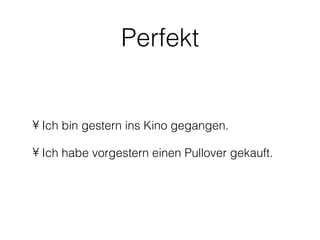 Das Dokument behandelt die Bildung und Verwendung des Perfekts im Deutschen, einschließlich der Hilfsverben 'haben' und 'sein'. Es werden zahlreiche Beispiele für verschiedene Verbgruppen, Reflexiv- und transitive Verben sowie die Bildung des Partizips II gegeben. Weitere Themen sind die Unterscheidung zwischen schwachen und starken Verben sowie die Verwendung von untrennbaren und trennbaren Verben im Perfekt.