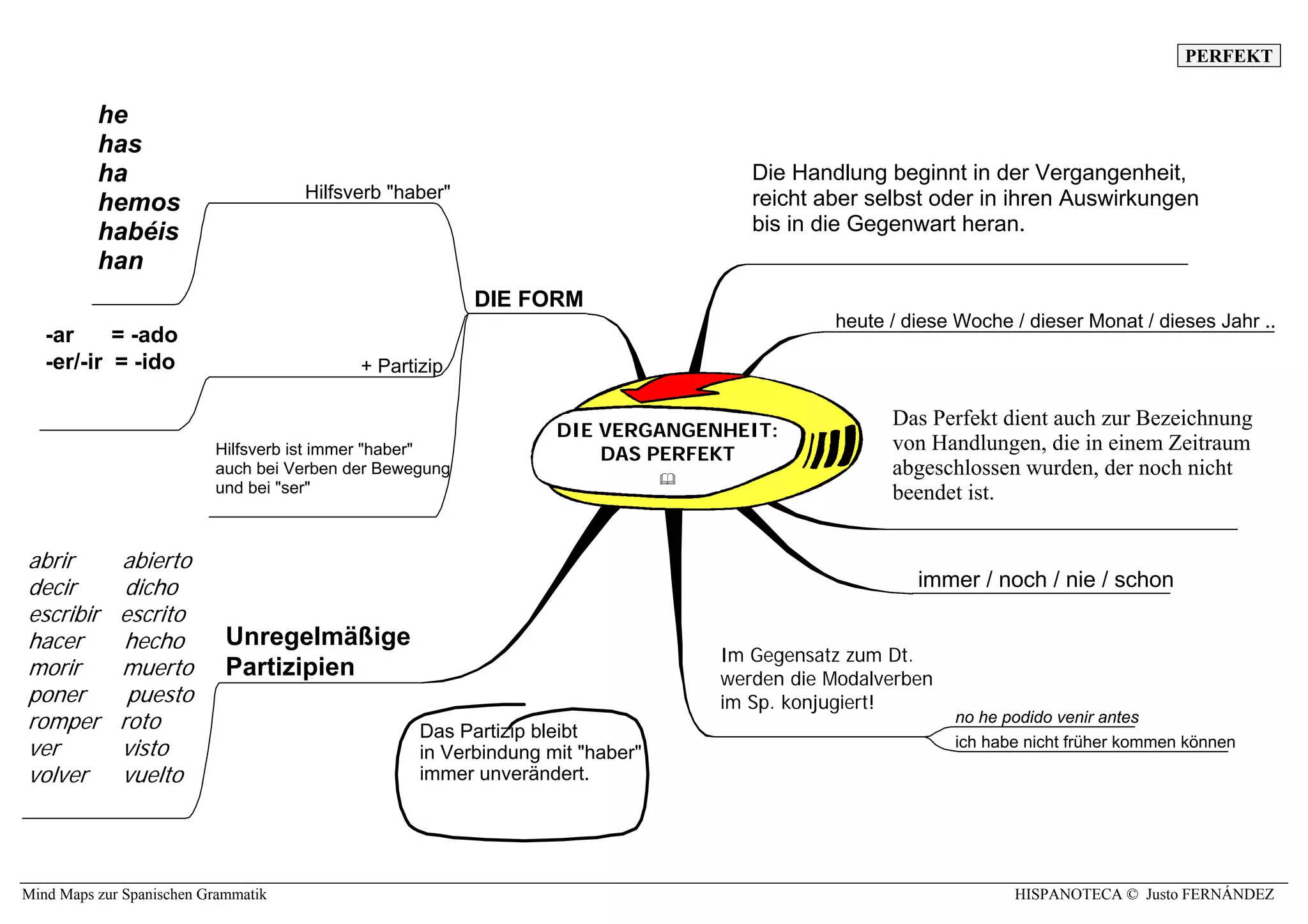 Das Dokument behandelt das spanische Perfekt, das Handlungen beschreibt, die in der Vergangenheit abgeschlossen wurden, aber noch Einfluss auf die Gegenwart haben. Es erklärt die Verwendung des Hilfsverbs 'haber' und die Bildung von Partizipien, sowie die Konjugation von Modalverben im Spanischen. Zudem werden Beispiele für unregelmäßige Partizipien gegeben.