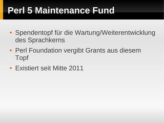 Der Perl 5 Maintenance Fund wurde 2011 ins Leben gerufen, um die Wartung und Weiterentwicklung des Perl 5 Sprachkerns zu unterstützen, wobei Stipendien von der Perl Foundation vergeben werden. In den ersten fünf Monaten wurden über 540 Arbeitsstunden auf die Behebung tiefgreifender Bugs und Verbesserungen verwendet, und insgesamt etwa 1100 Stunden wurden investiert. Der Fördertopf hat bereits Beiträge von zahlreichen Firmen und Privatpersonen erhalten, um die weitere Entwicklung sicherzustellen.