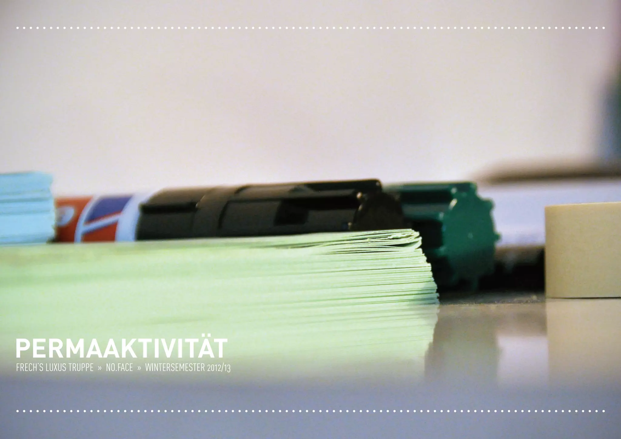 Das Dokument beschäftigt sich mit der 'permaaktivität' und verschiedenen Aspekten der digitalen Persönlichkeit im Rahmen der Veranstaltung 'frech's luxus truppe» no.face' im Wintersemester 2012/13. Es werden Themen wie Kategorien, Muster und Vorgehensweisen sowie der Zusammenhang und die Anwendung von Konzepten angesprochen. Zudem wird ein Augenmerk auf mögliche Gefahren und eine Vernetzung gelegt.