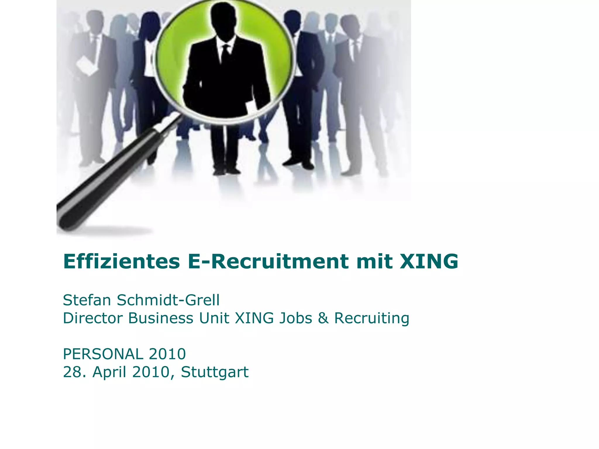 Das Dokument behandelt die effiziente Nutzung von e-Recruiting über die Plattform Xing, die über 8,75 Millionen Mitglieder weltweit hat. Es beschreibt die Vorteile von Xing Jobs, einschließlich der Ansprache aktiver und passiver Kandidaten durch gezielte Jobangebote und soziale Netzwerke. Zudem werden die Merkmale der Recruiter-Mitgliedschaft und deren Effizienz bei der Kandidatensuche hervorgehoben.