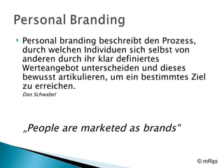 Personal Branding beschreibt den Prozess, wie Individuen sich durch ein klar definiertes Werteangebot von anderen abheben und gezielt kommunizieren, um ihre Ziele zu erreichen. Die Entwicklung einer Marke erfordert das Finden eines einzigartigen Verkaufsarguments, aktives Zuhören, den Aufbau von Netzwerken und die Nutzung von Online-Plattformen für Inhalte. Letztendlich sind die Individuen für ihre eigene Marke verantwortlich und müssen heute mit dem Branding beginnen, um erfolgreich zu sein.