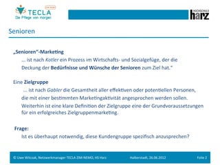 Das dokument behandelt die Bedürfnisse und Herausforderungen der Seniorenmarktsegmentierung in Deutschland, indem es auf die heterogene Altersgruppe der 50plus eingeht und die Notwendigkeit einer zielgerichteten Ansprache und Anpassung von Produkten und Dienstleistungen betont. Es wird prognostiziert, dass die Nachfrage nach seniorengerechten Angeboten bis 2050 stark ansteigen wird, vor allem durch demographische Veränderungen und den Umstieg auf ambulante versus stationäre Pflege. Das Netzwerk 'tecla zim-nemo' zielt darauf ab, durch innovative Lösungen die Lebensqualität und Selbstständigkeit älterer Menschen zu fördern.
