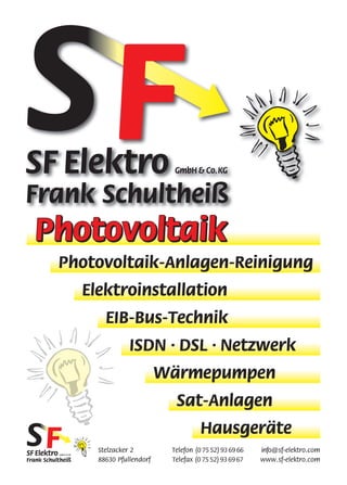 Photovoltaikanlagen sind am besten auf südorientierten Flächen mit einer Neigung von 30°-45° platziert, da Verschattungen die Energieerzeugung erheblich beeinträchtigen können. Eine 2-kW-PV-Anlage produziert bei optimalen Bedingungen etwa 1.900 kWh Strom jährlich, was eine Einspeisevergütung von rund 887,30 Euro pro Jahr für die ersten 20 Jahre ergibt. Das Dokument bietet auch Informationen zu Vergütungssätzen, benötigter Fläche und Montagekosten, sowie der Möglichkeit von Förderprogrammen.