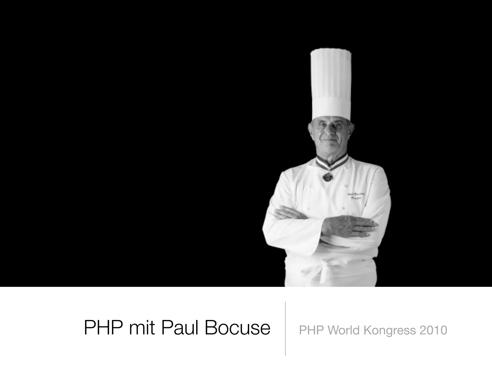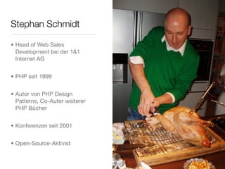 Das Dokument behandelt die Verbindung zwischen PHP-Entwicklung und Kochkunst, dargestellt durch die Beiträge von Paul Bocuse und Stephan Schmidt zur PHP World Congress 2010. Es erläutert wichtige Prinzipien der Softwareentwicklung wie sauberen Code, Coding-Standards und Design-Patterns, und hebt die Bedeutung von effektiven Methoden und Teamdynamik hervor. Die Herausforderungen der hohen Komplexität und Änderungsanforderungen in großen Softwareprojekten werden ebenfalls diskutiert.