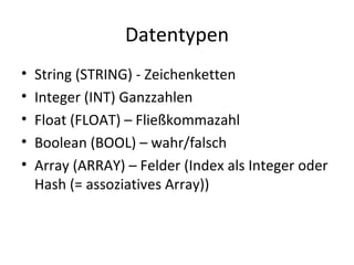 Das Dokument behandelt Variablen und Datentypen in PHP, insbesondere Strings, Integers, Floats, Booleans und Arrays. Variablen werden in PHP mit einem Dollarzeichen ($) eingeleitet, und Beispiele demonstrieren, wie Werte gespeichert und ausgegeben werden. Es wird auch auf die richtige Handhabung von Zahlen und Zeichenketten hingewiesen, einschließlich der Verwendung von Punkten für Dezimalstellen.