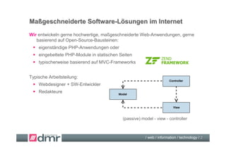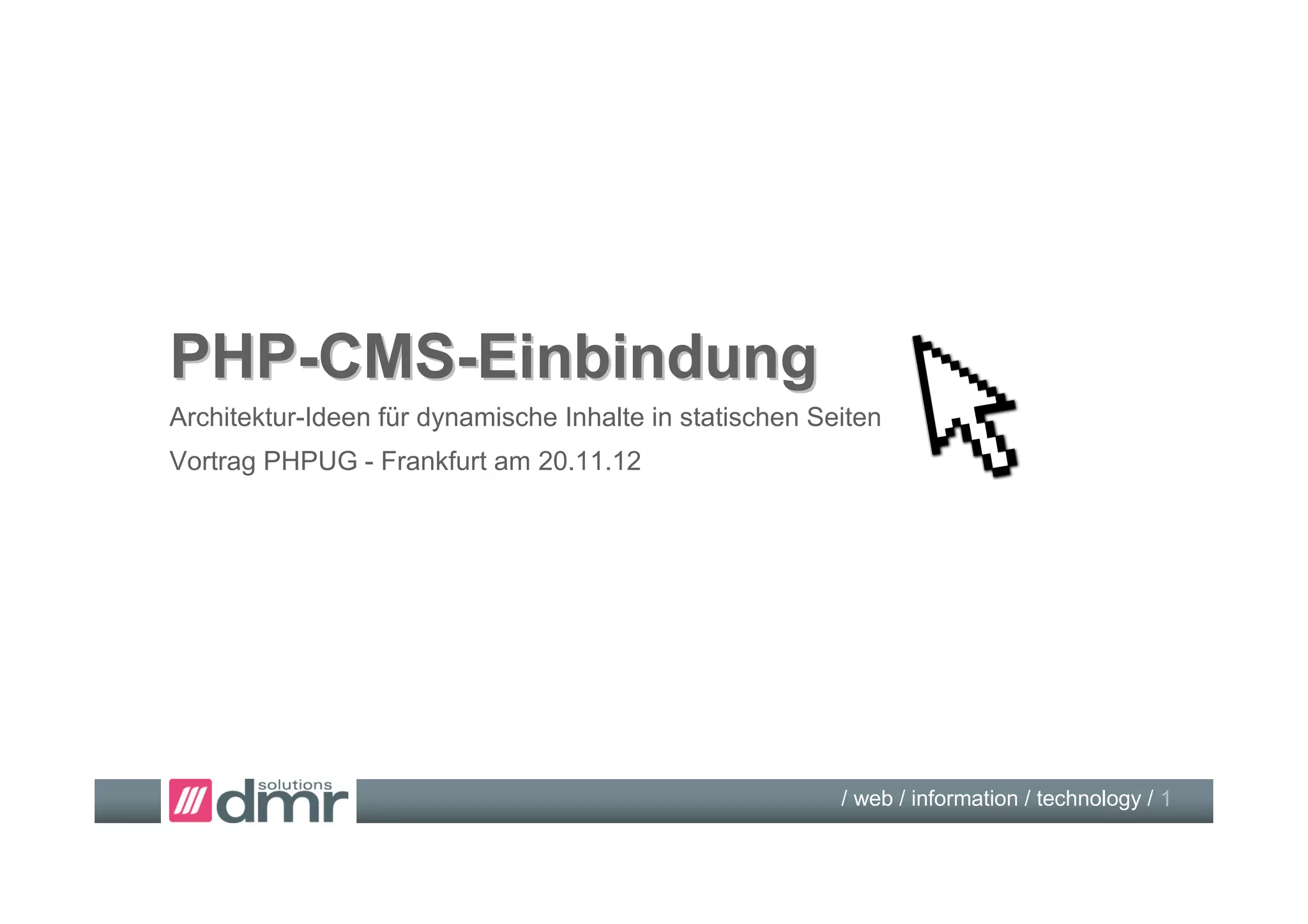 Das Dokument beschreibt Architekturideen zur Integration von PHP-CMS in statische Webseiten, einschließlich maßgeschneiderter Softwarelösungen und typischer Arbeitsteilung zwischen Webdesignern und Entwicklern. Es werden verschiedene Ansätze zur Content-Pflege und zur Einbindung von Widgets sowie CMS-Beispiele wie OpenText und FirstSpirit vorgestellt. Zusätzlich wird auf Diskussionen über verschiedene Technologien und Content-Management-Systeme eingegangen.
