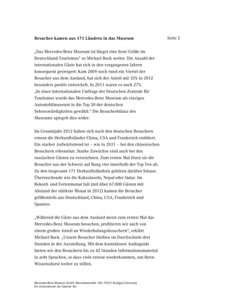 Im Jahr 2012 besuchten 722.000 Gäste das Mercedes-Benz Museum in Stuttgart, was eine Steigerung der Besucherzahl im Vergleich zum Vorjahr darstellt. Die Sonderausstellung "Zeitlos – 60 Jahre Mercedes-Benz SL" sowie zahlreiche Veranstaltungen zogen internationale Besucher an, wobei 35% der Gäste aus dem Ausland kamen, u.a. aus China, den USA und Frankreich. Mit über 99% Weiterempfehlungsrate und zahlreichen Führungen und Veranstaltungen bleibt das Museum eine beliebte Attraktion im deutschen Tourismus.