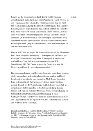 Die Mercedes-Benz Bank und die HDI Versicherung intensivieren ihre Partnerschaft im Bereich Kfz-Versicherungen, um das Wachstum in Deutschland zu fördern, wobei HDI den Zuschlag bei einer Ausschreibung erhielt. Der Bestand der Mercedes-Benz Bank umfasst über 240.000 Versicherungen, und das Unternehmen plant, innovative Produkte einzuführen, um neue Kunden zu gewinnen. Diese Kooperation ist für beide Unternehmen von strategischer Bedeutung und zielt darauf ab, die Attraktivität der Kfz-Versicherung zu steigern.