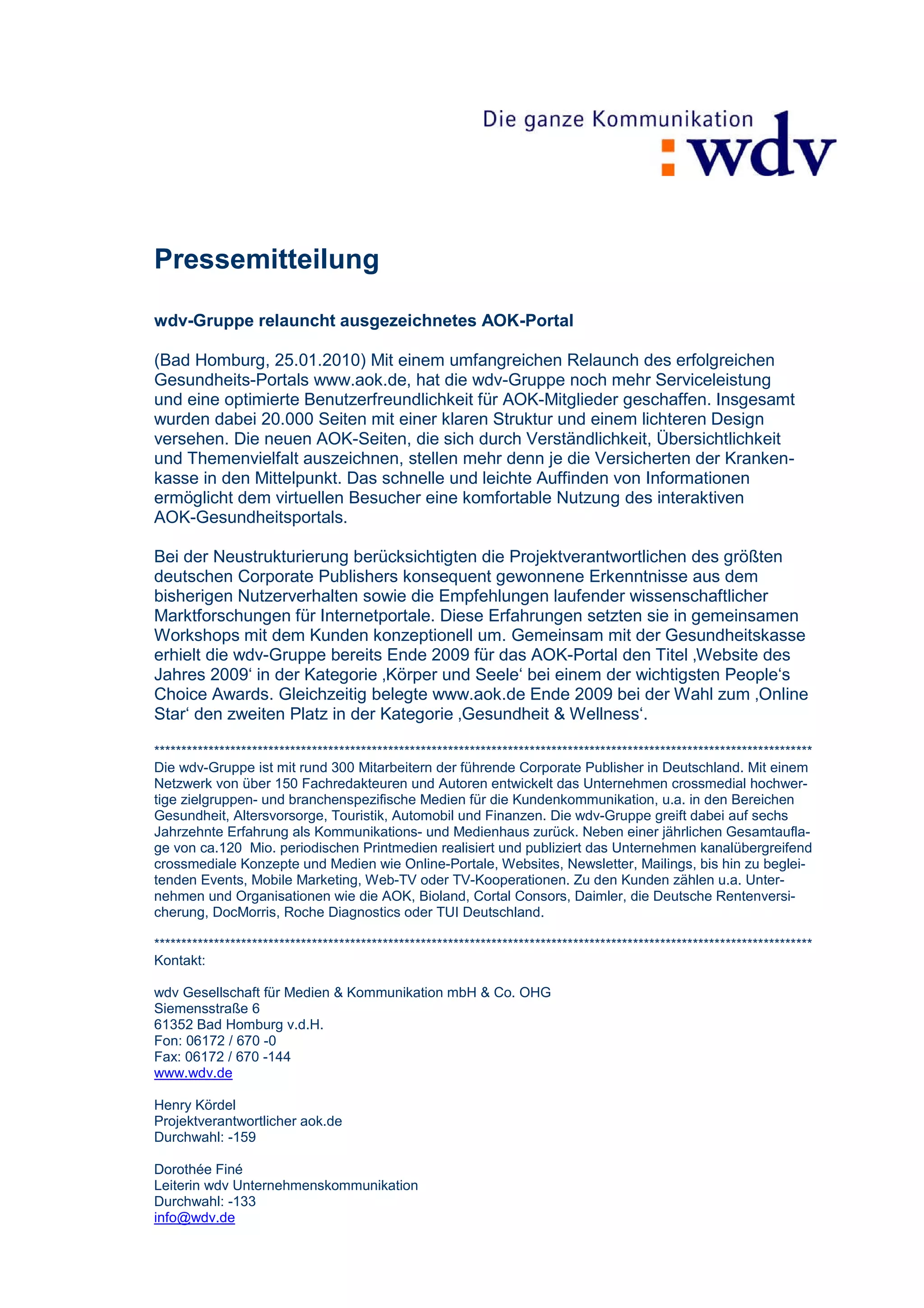 Die wdv-gruppe hat das Gesundheitsportal www.aok.de umfassend relauncht, um die Benutzerfreundlichkeit und den Service für AOK-Mitglieder zu verbessern. Das neue Design umfasst 20.000 Seiten mit klarer Struktur und erhöhtem Informationszugang, wobei Nutzerverhalten und Marktforschungen berücksichtigt wurden. Das Portal wurde 2009 als ‚Website des Jahres‘ ausgezeichnet und belegte den zweiten Platz beim ‚Online Star‘ in der Kategorie Gesundheit & Wellness.