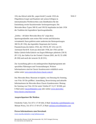 Die Sonderausstellung "Zeitlos – 60 Jahre Mercedes-Benz SL" zeigt die gesamte SL-Familie und ihre legendären Modelle, die seit 1952 die Begeisterung für die Marke repräsentieren. Die Ausstellung umfasst historische Rennsportwagen sowie moderne Modelle und bietet ein umfangreiches Begleitprogramm mit Führungen und Veranstaltungen. Das Mercedes-Benz Museum in Stuttgart ist von Dienstag bis Sonntag geöffnet und bietet neben der Ausstellung auch Informationen über Führungen und Reservierungen.